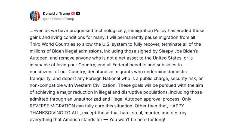In a post on his Truth Social platform, Trump outlined a series of immigration measures, stating he would “terminate all of the millions of Biden illegal admissions, including those signed by Sleepy Joe Biden’s Autopen, and remove anyone who is not a net asset to the United States, or is incapable of loving our Country.” He added that all federal benefits and subsidies to noncitizens would end and that migrants who undermine domestic tranquility would be subject to denaturalization and deportation.